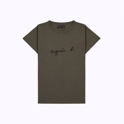 春夏季新款agnes b草书PALEESIJA字母纯棉短袖T恤深蓝色女装