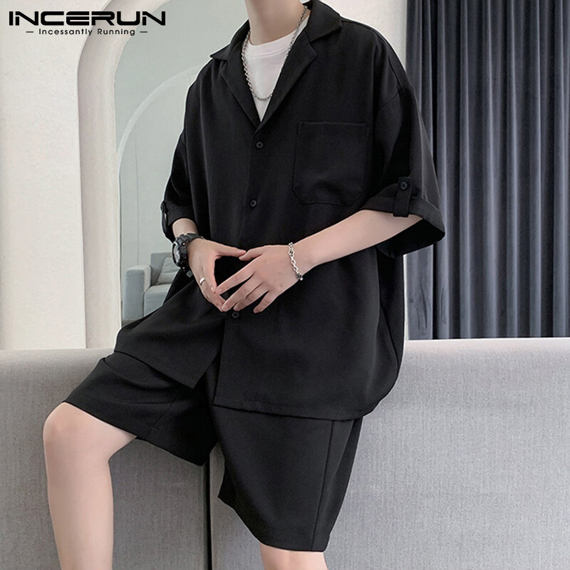 INCERUN男式短袖韩式休闲西装纽扣衬衫弹性腰间短裤套装(韩式)